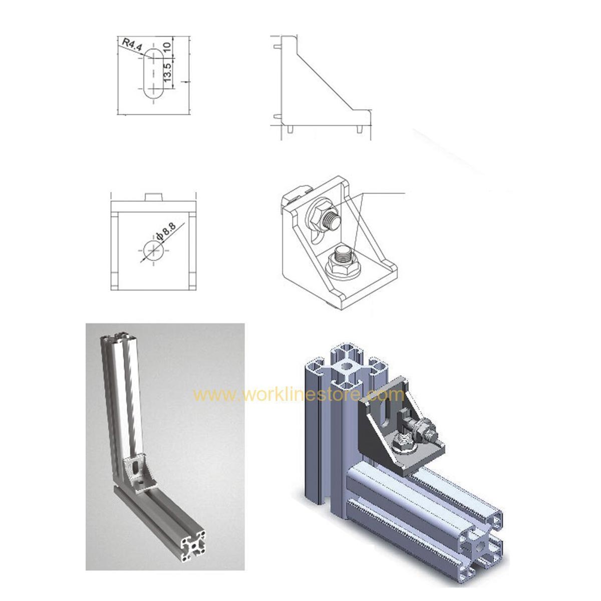 Staffa angolare rinforzata in alluminio per congiunzione tra due profilati o tra profilato e struttura portante