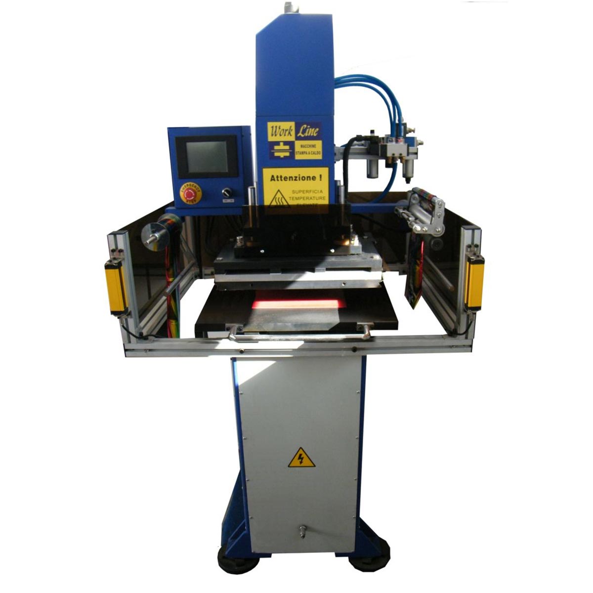 Questa macchina ha un'area di stampa 450 x 290 mm. Dotata di una pressione di stampa di 8 Tonnellate permette di stampare e fustellare, tramite il controller touchscreen.